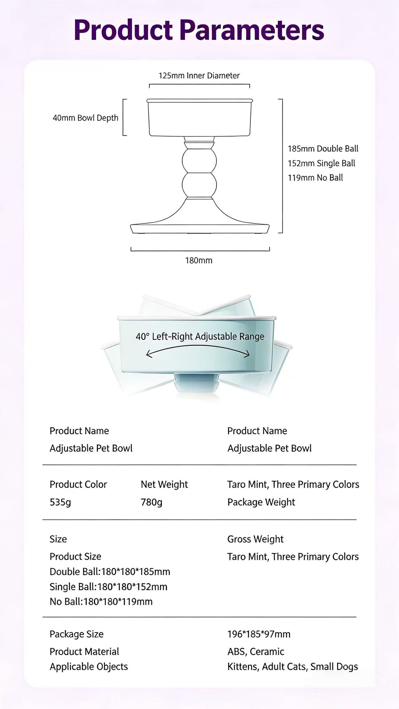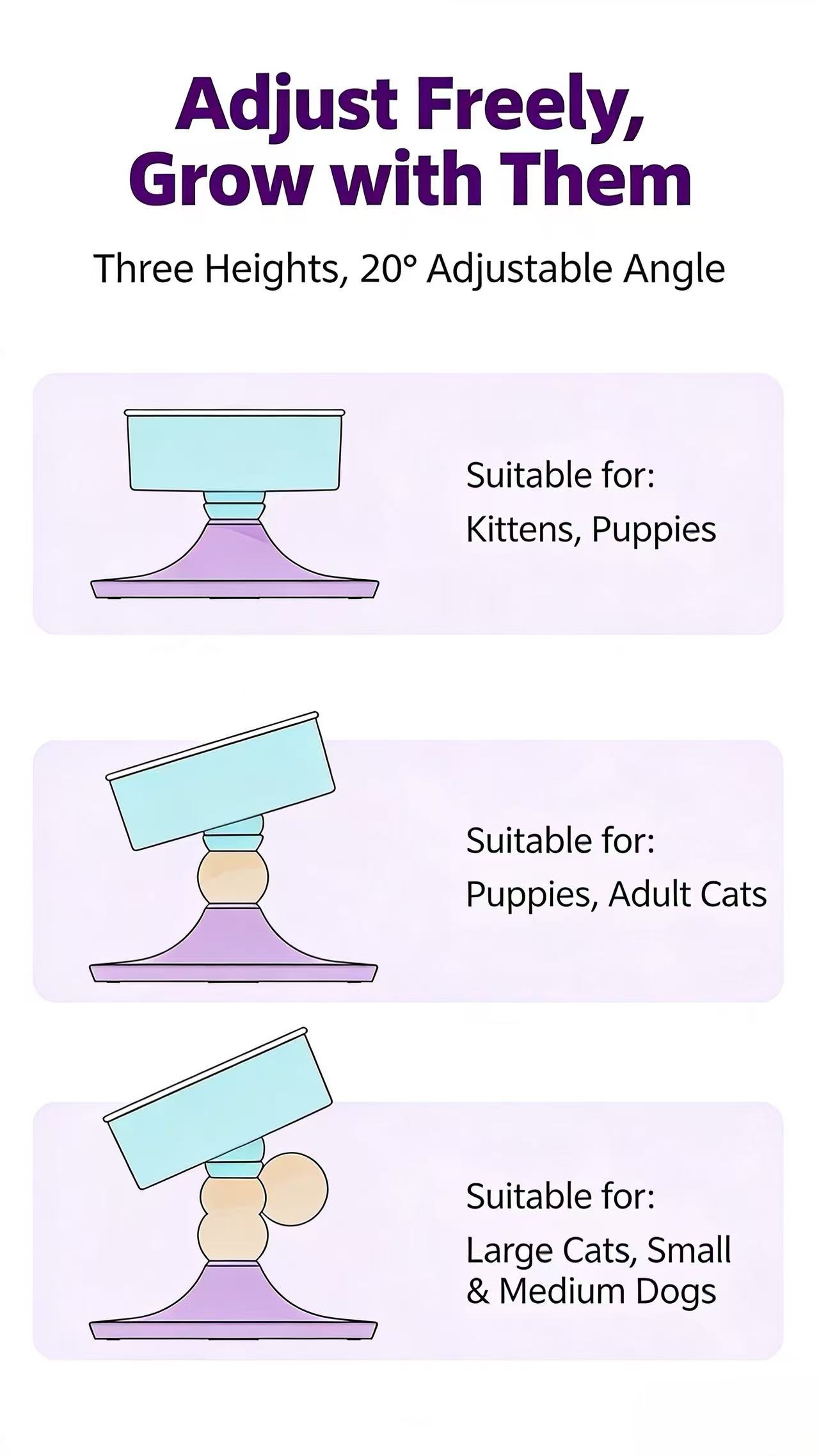 This adjustable pet bowl offers three height options and a 20° tilt angle to help protect your pet's neck health. Made from food-grade ABS plastic and high-temperature ceramic, it's both durable and stylish. Available in two colors and a double bowl set is also available. Suitable for both cats and dogs.