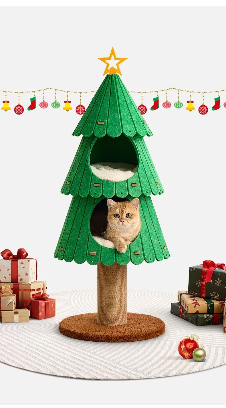 Elevate your home décor with the creative Christmas tree cat tree, featuring multi-level cat nests and a widened, stable base. It's both beautiful and practical, creating a festive atmosphere while providing a fun climbing and scratching ground for your cat. The cat tree is made from felt, particleboard, and Arctic Velvet fabric.